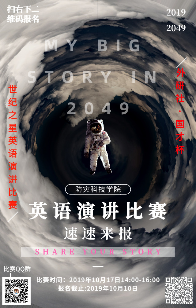 7、演讲题目:英语专业学生组、非英语专业学生组均采用“外研社·国才杯”全国英语演讲大赛的题目:My Big Story in 2049: _____。与题目相关的视频见大赛官网。演讲时间为3分钟。