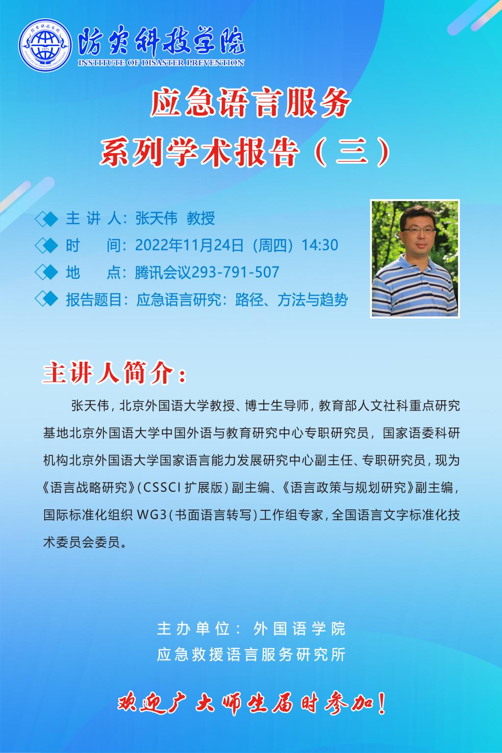 为提高beat365官网师生应急语言服务专业及学术水平,beat365官网将于2022年11月24日下午14:30邀请北京外国语大学张天伟教授做题为“‘应急语言服务’概略”的学术报告。欢迎广大师生参加,详情见海报。
