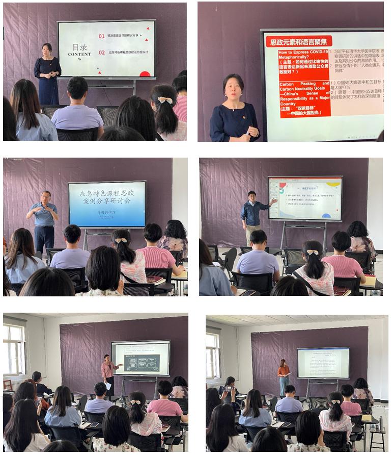 活动以“重点分享+广泛讨论”的形式开展。 池丽霞院长首先分享了省级项目“大学英语阅读课程思政资源库建设”的经验并对应急特色课程思政建设的总目标和思路,以及应急特色思政元素的挖掘等进行了阐述;指出立足大学英语课程,探索应急特色课程思政的实践路径,构建体现校本特色的大学英语课程思政体系。随后,公共外语教研室的高丽梅老师、李辉老师以及英语专业教研室的李恩庆老师分别分享了相关的课程思政案例。高丽梅老师聚焦灾害主题影视作品鉴赏,以电影《后天》为切入点,在讲授自然灾害相关语言表达的基础上引导学生进行“人类未来及人类命运共同体”的批判性思考;李辉老师依托说明文的阅读,在讲授阅读技巧的基础上引入“人与自然关系”这一辩题,将课程的知识目标,能力目标和素质目标巧妙地融入到课程中;李恩庆老师在综合英语课程思政案例的分享中创新性地提出了“Spontaneous and Ubiquitous”的英语课程思政理念,并通过雨课堂中的教学实录向大家展示了课程思政如何以“化繁为简”的形式微妙融入综合英语的教学中。