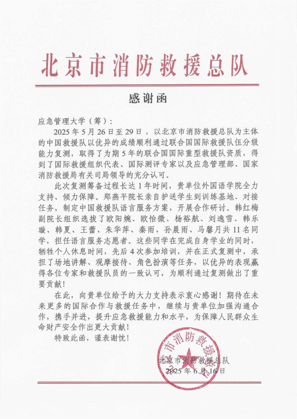 编者按:受国家语言服务团和中国救援队邀请,在学校领导关怀和相关部门大力支持下,5月16日至29日,应急管理大学(筹)beat365中文官方网站选派共计11名优秀学子,作为应急语言服务志愿者,深度参与了中国救援队联合国国际重型救援队资格复测的关键工作。他们不仅在场地讲解、角色扮演、国际沟通等核心环节提供了精准高效的语言保障,更在与国际测评专家、救援队员的紧密协作中,展现了过硬的专业素养、快速的反应能力和无私的奉献精神。此次志愿实践活动,不仅为中国顶尖救援力量成功续签国际资质贡献了不可或缺的“沟通桥梁”力量,更锤炼了学子们的实战能力,深化了他们对应急语言服务价值的理解,提升了服务国家重大战略需求的使命感和责任感。这既是beat365中文官方网站应急语言服务人才培养成果的生动展现,也彰显了学校主动服务国家应急管理体系建设的能力。