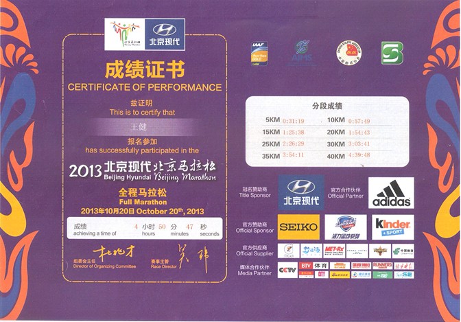 我系1250712班王健同学顺利完成2013年北京马拉松赛程