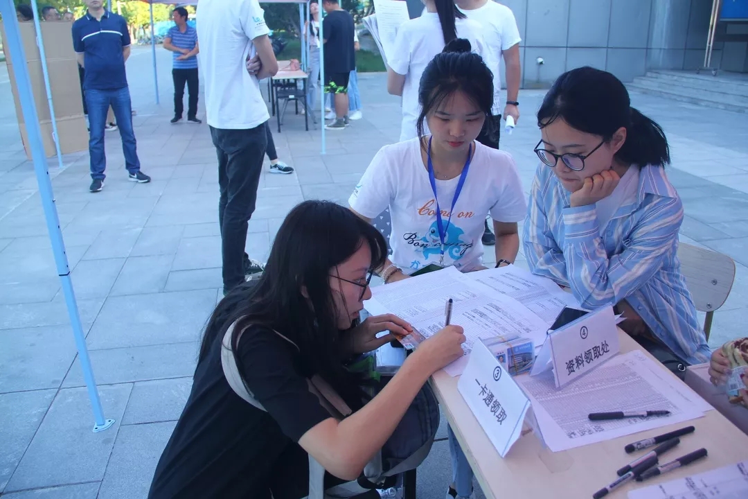 28日下午,迎新工作正式开始。此时虽正是俗称秋老虎的时节,但老师及志愿者都保持着高度的热情迎接每一位前来报道的新生。前排的学姐们耐心地指导新生们办理入学手续,有条不紊的完成着收集团员档案、发放学生卡、完成信息登记等一系列工作。后排的学长们顶着炎炎烈日协助新生完成缴费流程,并为整个工作的开展提供后勤保障。老师们则亲切地同新生及家长交流沟通,解答他们的疑问。当天下午由于学校缴费系统发生故障,新生个人信息未能成功登记导致无法完成缴费,部分家长焦虑不安,担心会对入学产生影响,正是在老师们的安抚及帮助下问题得以解决。29日的工作进行的尤为顺利,在前一日的工作基础之上,志愿者们进一步明确分工,并采用轮班制的原则娴熟地完成着工作。当天下午6时许,招新工作圆满结束。最后老师同志愿者们进行合影留念。