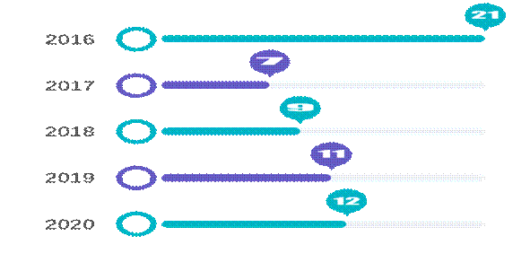 59篇论文中,2016年发表21篇,2017年发表7篇,2018年发表9篇,2019年发表11篇,2020年发表12篇。
